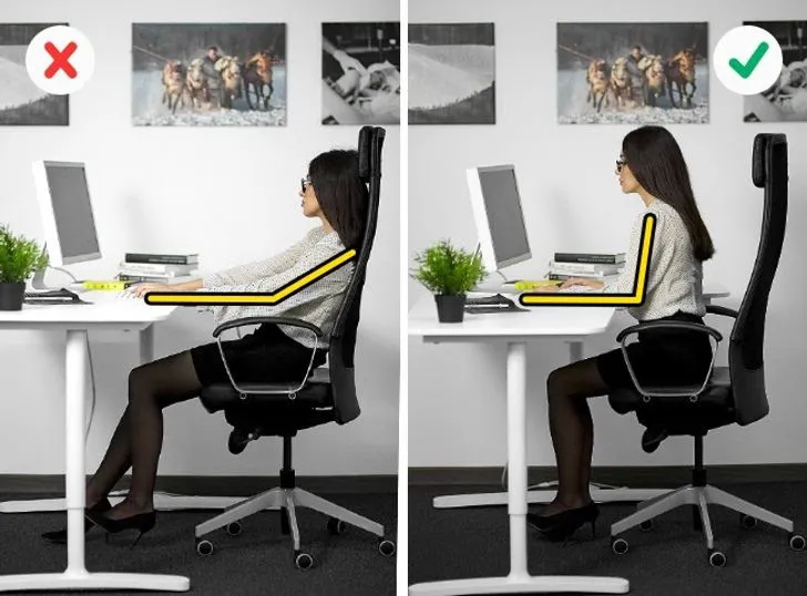 Nếu vị trí ngồi không thoải mái, bạn có thể điều chỉnh lại ghế. Bạn không nên để chân lơ lửng không điểm tựa, cũng như không nên để phần rìa ghế ép vào phía dưới đầu gối. Tốt nhất, hãy để chân chạm sàn hoặc trên vật đỡ nào đó, cho phép chân xếp ở một góc lớn hơn 90 độ một chút.