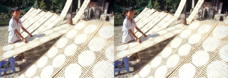 Người thợ phụ (có thể là trẻ con, người cao tuổi) dùng tay sửa sang lại chiếc bánh cho thật đều và khi bánh đã trải đầy liếp thì mang ra phơi.