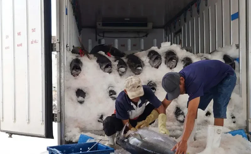 | Cá ngừ đại dương sau sơ chế được ướp đá lạnh từ bên trong lẫn bên ngoài trên các xe đông lạnh để vận chuyển đến các tỉnh thành. |