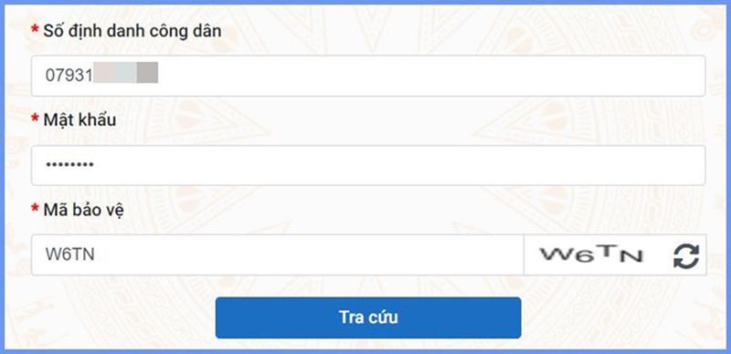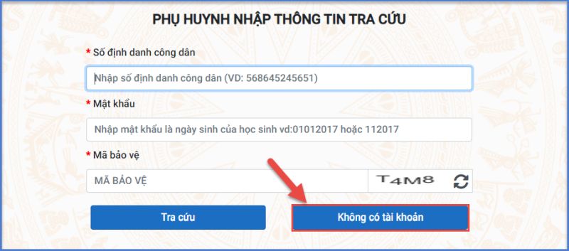 => PHHS nhập Số định danh cá nhân, Mật khẩu là ngày tháng năm sinh của học sinh (VD: ngày sinh 09/10/2017, mật khẩu là 09102017) và [Tra cứu].