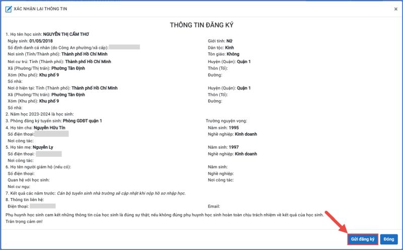 PHHS rà soát lại thông tin hồ sơ tuyển sinh đã đăng ký. Kích nút [Gửi đăng ký] để gửi hồ sơ của học sinh về Phòng GD&ĐT đăng ký tuyển sinh.