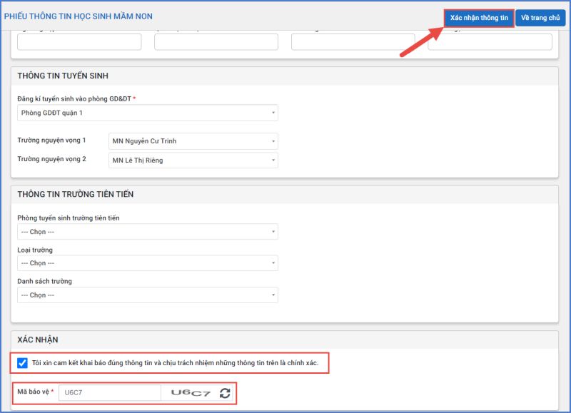 Sau khi hoàn thiện hồ sơ học sinh, PHHS nhập Mã bảo vệ, tích Tôi xin cam kết khai báo đúng thông tin và [Xác nhận thông tin] để gửi hồ sơ của học sinh về Phòng GD&ĐT đăng ký tuyển sinh.