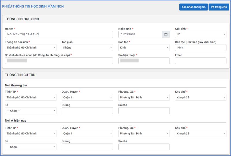 Phiếu thông tin sẽ hiển thị đầy đủ thông tin nhà trường cuối cấp đã khai báo, PHHS kiểm tra chính xác thông tin cá nhân của học sinh (đặc biệt yêu cầu chính xác trường Số điện thoại tại Thông tin học sinh phục vụ công tác liên hệ trong giai đoạn tuyển sinh).