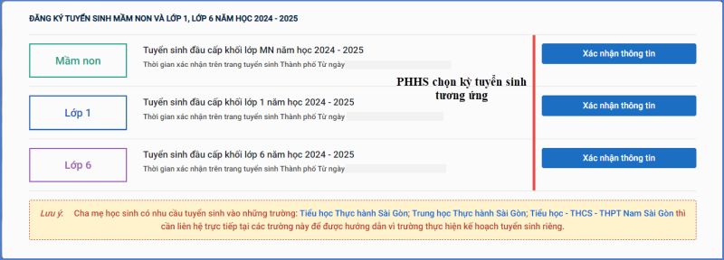 PHHS chọn kỳ [Tuyển sinh đầu cấp khối lớp MN năm học 2024-2025] và nhấn nút “Xác nhận thông tin”.