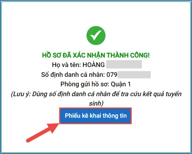 Sau khi xác nhận và đăng ký thông tin tuyển sinh thành công. PHHS cần xuất Phiếu kê khai thông tin để lưu lại dữ liệu đã xác nhận đăng ký tuyển sinh.