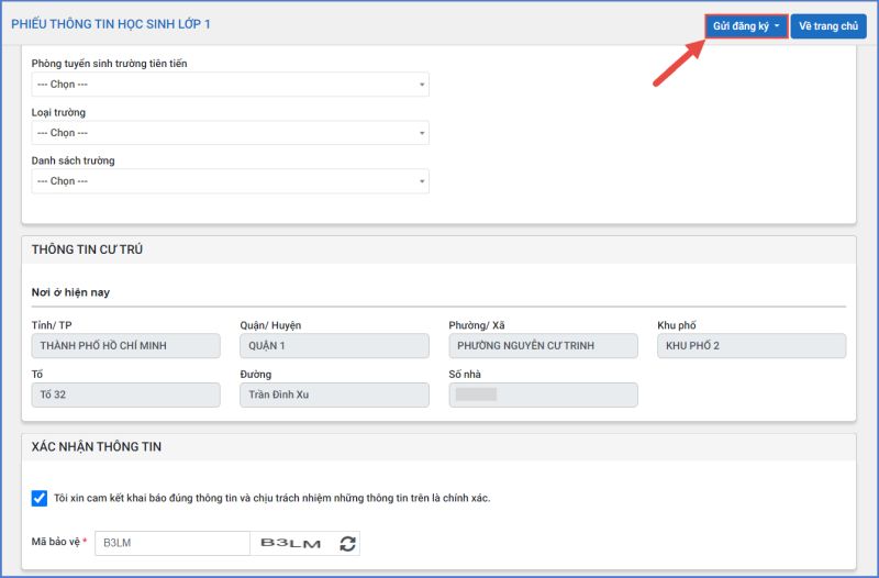 Bước 6: Sau khi hoàn thiện hồ sơ học sinh, PHHS nhập Mã bảo vệ, tích Tôi xin cam kết khai báo đúng thông tin và [ Gửi đăng ký] để gửi hồ sơ của học sinh về Phòng GD&ĐT đăng ký tuyển sinh.