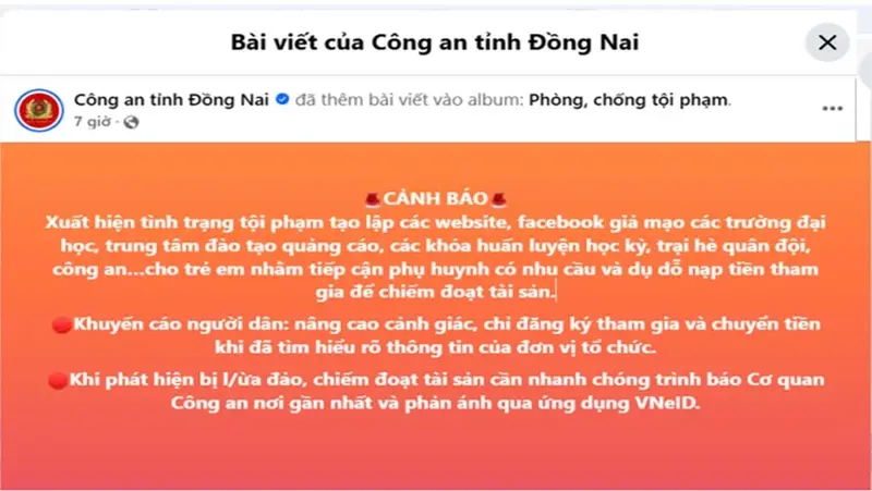 | Thông tin cảnh báo trên trang Fanpage chính thức của Công an tỉnh Đồng Nai. (Ảnh chụp màn hình). |