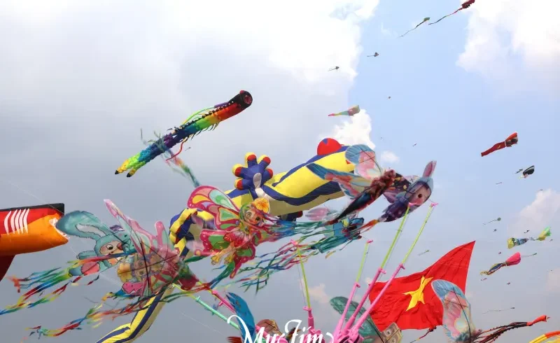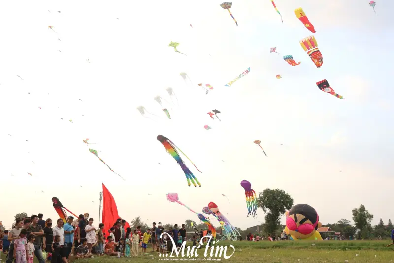 Hàng trăm cánh diều với nhiều kích thước và hình dáng khác nhau bay lượn trên bầu trời, tạo nên khung cảnh rực rỡ và đầy sức sống.
