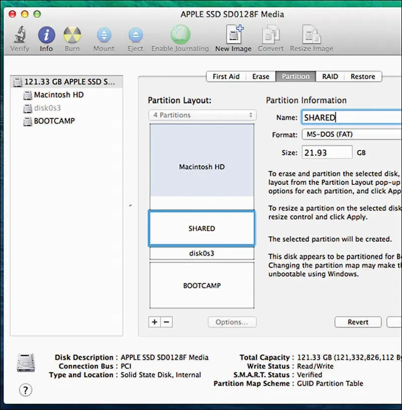 Bạn có thể dùng tiện ích Disk Utility để chia nhỏ một trong những phân vùng hiện tại và tạo ra một phân vùng mới rồi định dạng với hệ thống FAT32. Hiện nay, các phiên bản mới của hệ điều hành Windows (như Windows 7, 8) không cài đặt được trên định dạng FAT32. Do đó, bạn cần phải tách biệt Mac và Windows.