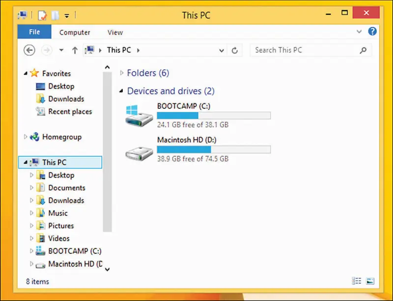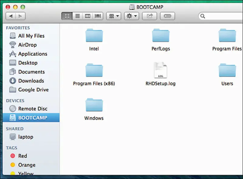 Gói driver Boot Camp của Apple sẽ tự động cài đặt một trình điều khiển HFS+ cho Windows và cho phép người dùng Windows xem được phân vùng Mac. Phân vùng này được hiển thị trong cửa sổ Computer với tên là Macintosh HD, nhưng bị hạn chế là chỉ mở file mà không lưu được file. Tức là, bạn không thể sao chép các file vào phân vùng Mac, cũng như không thể chỉnh sửa hoặc xóa chúng từ hệ điều hành Windows.