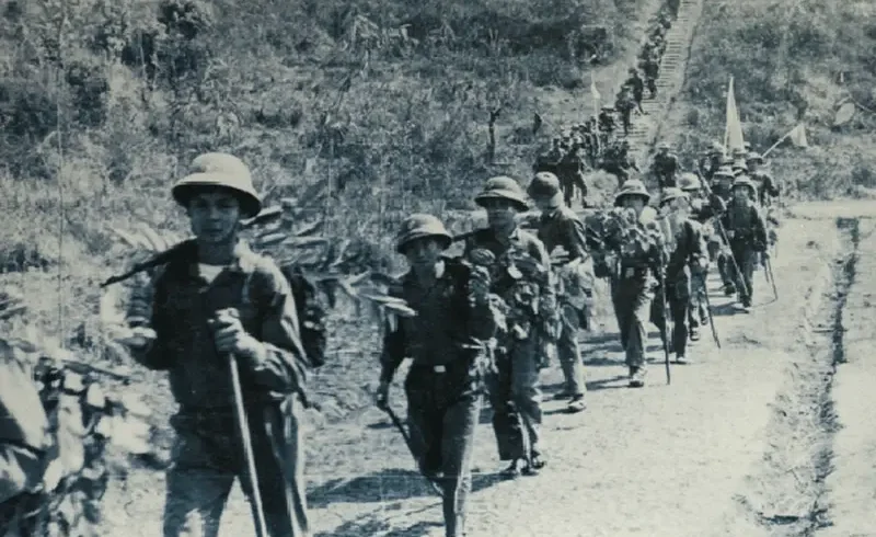 | Bộ đội hành quân trên đường Trường Sơn thời kỳ chống Mỹ. Ảnh tư liệu |