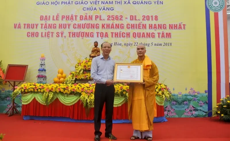- Hình bìa: Thừa ủy quyền của Chủ tịch nước, lãnh đạo thị xã Quảng Yên (Quảng Ninh) trao bằng truy tặng “Huy chương Kháng chiến hạng Nhất” của Thượng tọa, Liệt sĩ Thích Quang Tâm cho đại diện chùa Vãng.