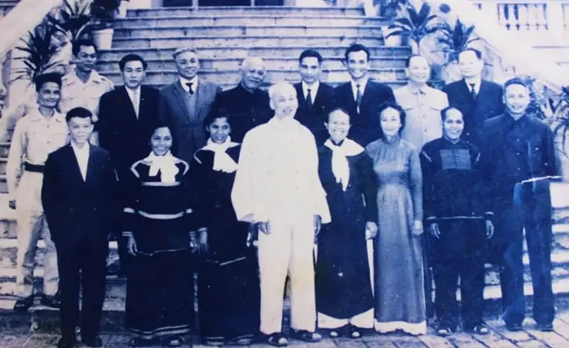 | Bà H’Yiêng (thứ hai, từ trái sang, hàng đầu) vinh dự được chụp ảnh với Bác Hồ. (Ảnh do nhân vật cung cấp) |