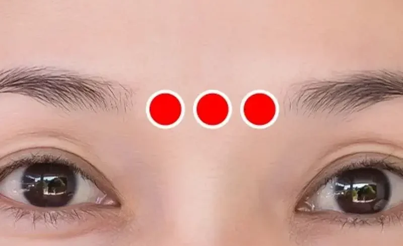 Để xóa nếp nhăn giữa hai lông mày, bạn cần đặt ngón trỏ, ngón giữa và ngón đeo nhẫn vào vị trí da theo 3 dấu chấm như hình trên. Nhấn vào vị trí đó trong 5 đến 7 giây, sau đó lặp lại một lần nữa.