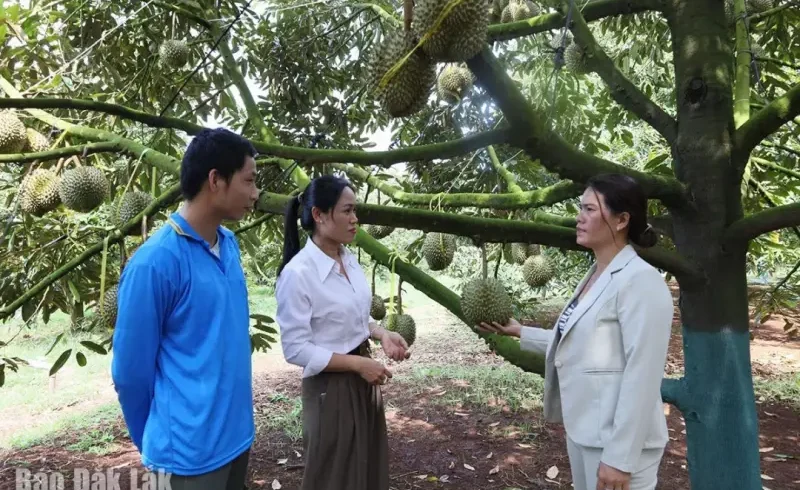 | Hội Nông dân xã Ea Knuếc tham quan vườn sầu riêng xuất khẩu của hội viên. |