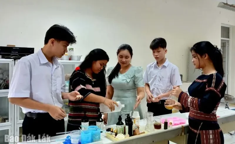 | Cô và trò trong Câu lạc bộ nghiên cứu khoa học kỹ thuật Trường phổ thông Dân tộc nội trú THPT Phú Yên nghiên cứu bào chế dược liệu gội đầu. Ảnh: T. Hiếu |
