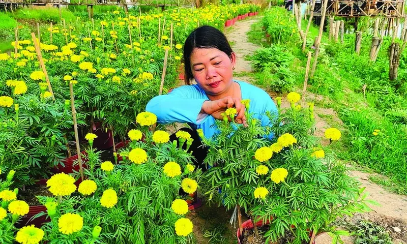 Nhà bà Lê Thị Thoa (xã Tân Thuận Đông, huyện Cao Lãnh, Đồng Tháp) có vườn rộng, có sẵn hệ thống tưới nước nên năm nay bà “tiện tay” trồng khoảng 1.000 gốc hoa vạn thọ ăn Tết. Nếu thị trường thuận lợi, 1.000 cây vạn thọ vô được 300 chậu hoa vừa vừa đem bán, bà Thoa có thêm chút tiền tiêu Tết.