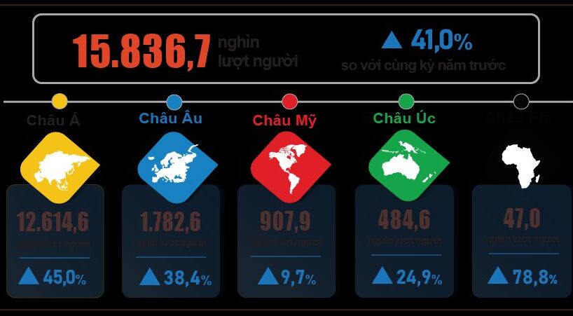 Châu Á là khu vực có nhiều khách quốc tế lớn nhất tại Việt Nam với hơn 12,6 triệu lượt khách, tăng 45%. Tiếp đến là châu Âu với gần 1,78 triệu lượt khách tăng 38,4%; châu Mỹ là 907,9 nghìn lượt tăng 9,7%; sau đó là châu Úc và châu Phi lần lượt là 484,6 nghìn lượt và 47,0 nghìn lượt, tăng 24,9% và 78,8%.