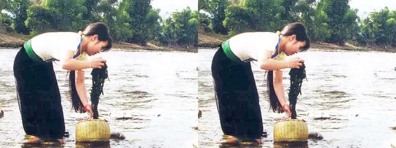 Thiếu nữ Thái đi lấy rêu ở suối Nậm Lay. Ảnh: Đỗ Doãn Hoàng