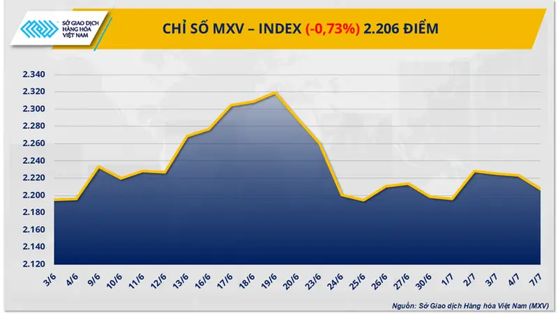 Theo Sở Giao dịch hàng hóa Việt Nam (MXV), sắc đỏ tiếp tục bao phủ thị trường hàng hóa nguyên liệu thế giới trong phiên giao dịch đầu tuần (7/7). Đóng cửa, chỉ số MXV-Index nối dài đà giảm sang phiên thứ 3 liên tiếp khi đánh mất hơn 0,7% về mức 2.206 điểm.