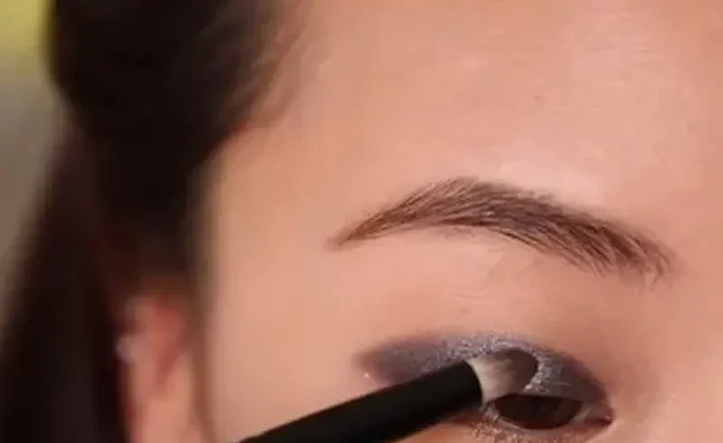 Thoa một lớp kem lót dành cho mắt rồi dùng phấn mắt màu xám có nhũ đánh ở phần bầu mắt. Kem lót giúp màu mắt lên đẹp và bền hơn.
