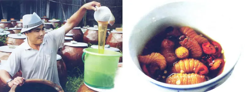 Chúng tôi nâng ly rượu đế đặc sản Phú Lễ (huyện Ba Tri, Bến Tre) uống nghe cái “trót” rồi gắp con đuông đưa lên miệng. Ai cũng hơi “dội” vì thấy ghê ghê nhưng ráng nhắm mắt làm liều.