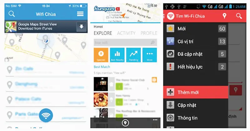 FourSquare là ứng dụng ghi lại thông tin các địa điểm (cà phê, quán ăn, nhà hàng, khách sạn…) mà bạn hoặc bạn bè của bạn đã từng trải nghiệm qua. Nó có một mục tên là Tips cho phép người dùng có thể ghi lại các đánh giá về địa điểm đó, thường thì mục này có kèm mật khẩu wifi của các địa điểm đó (nếu có). Vì thế, bạn có thể tìm wifi gần vị trí của bạn bằng cách sử dụng chức năng tìm kiếm của FourSquare với từ khoá “wifi” hoặc “free wifi”. Tuy xét về khả năng tìm mật khẩu wifi thì dữ liệu của FourSquare là khá ít so với Wifi Chùa và Tìm Wifi Chùa, nhưng nó cũng là một ứng dụng đáng để bạn tham khảo.