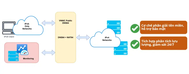 Trong quá trình chuyển đổi sang IPv6, mạng Internet với IPv4 vẫn tồn tại song song. Vì vậy, VNNIC Public DNS64 được cung cấp hoàn toàn miễn phí như là một phần trong hệ sinh thái DNS quốc gia (Hệ thống DNS – Domain Name System là thành phần trung tâm của Internet, được xem như “danh bạ điện thoại” của Internet, không chỉ đơn giản là một dịch vụ phân giải tên miền mà còn có vai trò quan trọng trong việc định tuyến, phân chia tải, bảo mật và hỗ trợ các dịch vụ trực tuyến). Trung tâm Internet Việt Nam sẽ tư vấn, hỗ trợ các cơ quan nhà nước triển khai các mạng truy cập IPv6 Only, sau đó sẽ mở rộng hỗ trợ các tổ chức, doanh nghiệp trong toàn bộ giai đoạn chuyển đổi theo lộ trình chung.