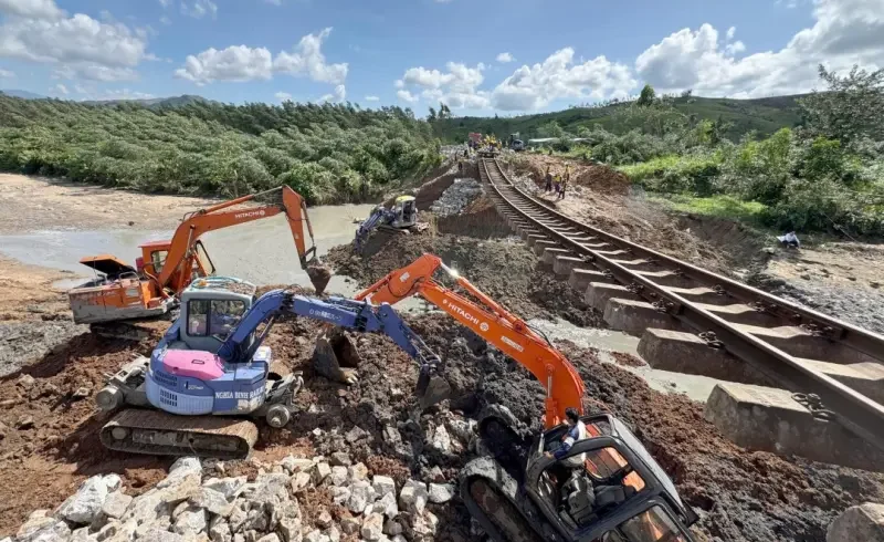 Cùng với đó, các đoàn tàu chở đá và vật tư kỹ thuật cũng được bố trí chạy đến hai đầu sạt lở, rút ngắn thời gian cung ứng và đẩy nhanh tiến độ thi công. Công tác khảo sát, đo đạc địa hình tiếp tục được thực hiện song song để điều chỉnh giải pháp phù hợp, vừa đảm bảo kỹ thuật, vừa bảo đảm an toàn cho lực lượng thi công trong điều kiện địa chất phức tạp.