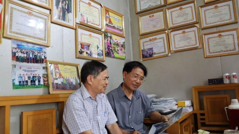 - Hình bìa: Thương binh Bùi Trung Thông (ngồi bên phải) ôn lại kỷ niệm một thời với cán bộ Hội Cựu chiến binh xã Cẩm Chế, huyện Thanh Hà, tỉnh Hải Dương