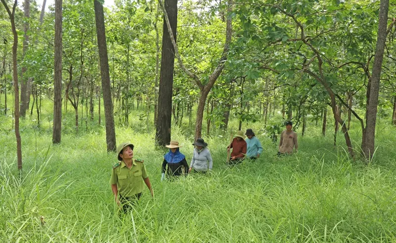 Gạt giọt mồ hôi sau nửa ngày đi bộ tuần tra trong rừng, chị Đào Thị Thúy (buôn Drăng Phôk, xã Krông Na, huyện Buôn Đôn) hào hứng kể về cơ duyên với nghề giữ rừng. Cách đây hơn 10 năm, VQG Yok Don có chính sách giao khoán QLBVR nên gia đình chị cùng với hơn 100 gia đình trong buôn Drăng Phôk nhận giao khoán QLBVR tại VQG Yok Don. Từ khi nhận khoán, các gia đình cắt cử người tham gia tuần tra, bảo vệ rừng cùng với lực lượng kiểm lâm. Những ngày đầu, công việc này chủ yếu do đàn ông đảm nhận, nhưng một thời gian sau, rất nhiều chị em trong buôn đã tham gia. “Được cán bộ kiểm lâm hướng dẫn nên công việc không gặp nhiều khó khăn, chỉ cần có sức khỏe và kiên trì là làm được”, chị Thúy chia sẻ.