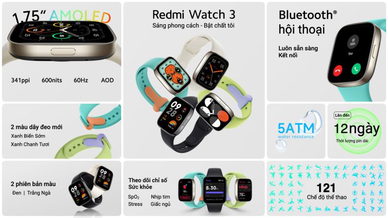 Sử dụng màn hình AMOLED 1,75 inch cùng nhiều tính năng tiện lợi như hỗ trợ gọi thoại qua Bluetooth, định vị thông qua hệ thống GPS đa băng tần (BDS, GPS, GLONASS, Galileo và QZSS) được tích hợp sẵn cùng khả năng kháng nước 5ATM, Redmi Watch 3 mang đến cho người dùng những trải nghiệm sử dụng hàng ngày hoặc khi tập luyện… với giá chưa tới 2 triệu đồng.