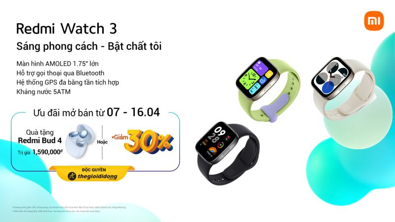 Đồng hồ thông minh Redmi Watch 3 chỉ bán tại hệ thống Thế Giới Di Động trên toàn quốc với giá 2.790.000 đồng. Tuy nhiên, từ ngày 7 – 16/4/2023, khi đặt mua Redmi Watch 3, khách hàng sẽ được giảm 30% giá bán khi mua kèm điện thoại Xiaomi, hoặc nhận quà tặng tai nghe Redmi Buds 4 trị giá 1.590.000 đồng.