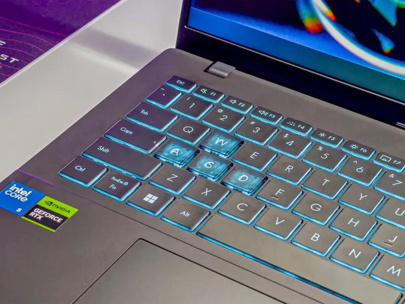 Mặt trong của máy trông khá ấn tượng với đèn nền xanh Turbo rực rỡ cùng cụm phím WASD và phím điều hướng trong suốt, mang đến cảm giác hiện đại và đậm chất gaming.