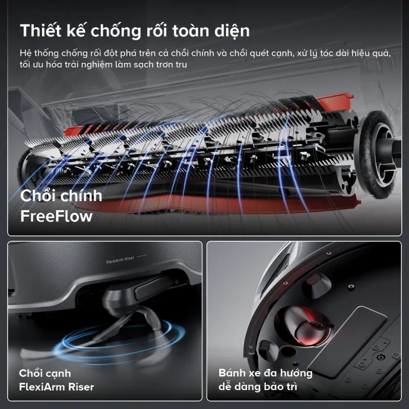 Quá trình dọn dẹp càng trở nên mượt mà hơn nhờ hệ thống chống rối kép. Chổi chính FreeFlow áp dụng cơ chế cuộn, chải phẳng và cắt nhỏ tóc, sau đó hút sạch với lực hút mạnh tới 22.000Pa. Chổi cạnh FlexiArm Riser với thiết kế hình cung giúp loại bỏ hiệu quả tình trạng vướng rối tóc và lông thú cưng, đảm bảo quá trình làm sạch diễn ra liền mạch, không cần can thiệp thủ công. Bên cạnh đó, bánh xe đa hướng của robot còn được tích hợp bàn chải để loại bỏ tóc cuốn vào, ngăn chặn cản trở trong quá trình di chuyển.