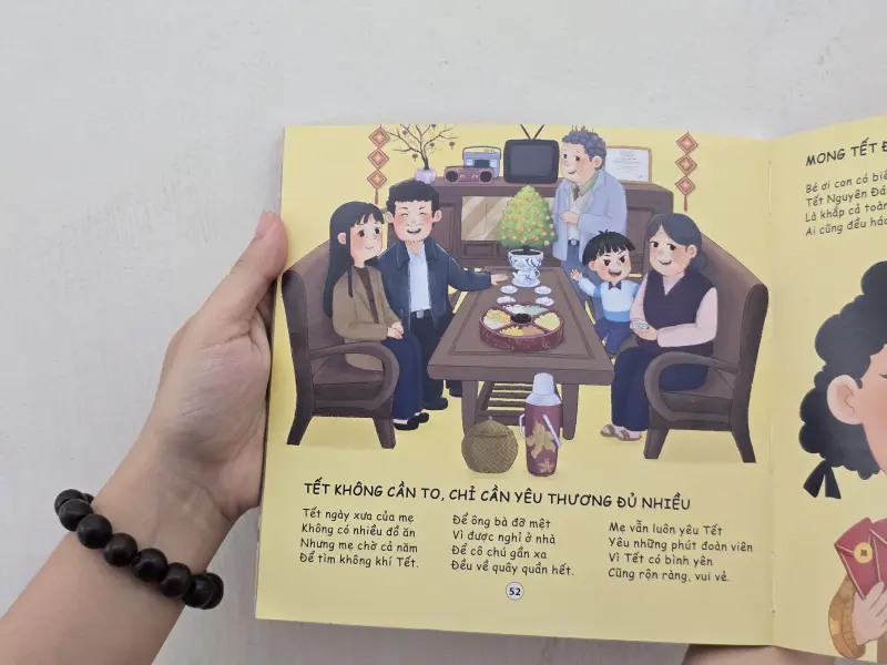 Tác phẩm là lời kể bằng những vần thơ vui tươi xen lẫn hoài niệm về Tết tuổi thơ của người mẹ thế hệ 9X dành cho đứa con bé bỏng. Đó là những kỷ niệm Tết vào những năm 2000 còn nhiều thiếu thốn. Giờ đây, khi khó khăn đã lùi xa, đời sống sung túc đủ đầy hơn, và ai ai cũng mong chờ để được đón Tết sum vầy bên gia đình.