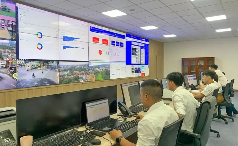 | Giám sát các dịch vụ tại Trung tâm điều hành đô thị thông minh tỉnh. Ảnh: Đỗ Lan |