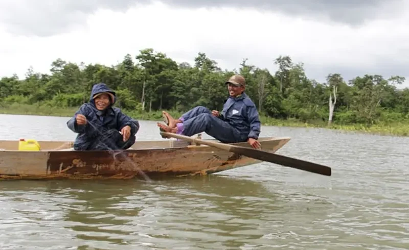 | Vợ chồng ông Huỳnh Ngọc Phước (thôn 1, xã Ea Bung) thả lưới trên hồ Ea Súp Thượng. |