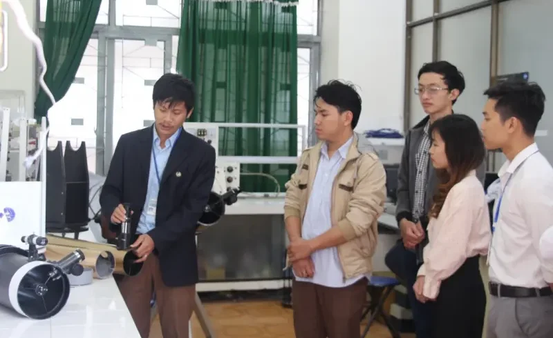 | Giảng viên Khoa Khoa học tự nhiên và Công nghệ hướng dẫn sinh viên nghiên cứu kính thiên văn. |
