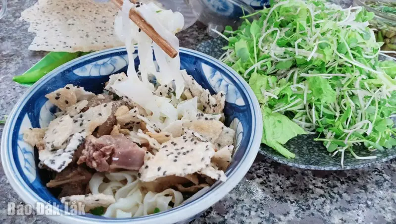 Thực khách ghé các quán mì quảng dọc Quốc lộ 1A đoạn Bình Tú, gọi một tô mì chỉ từ ba mươi ngàn đủ “combo” gồm bánh tráng mè nướng giòn bẻ kêu rôm rốp, lõi chuối cây thái mỏng trộn với các loại rau cải con, xà lách cùng chén nước mắm, tương ớt đậm đà. Trên mì rắc những hạt đậu phộng rang vàng óng ả, thơm nồng nàn.