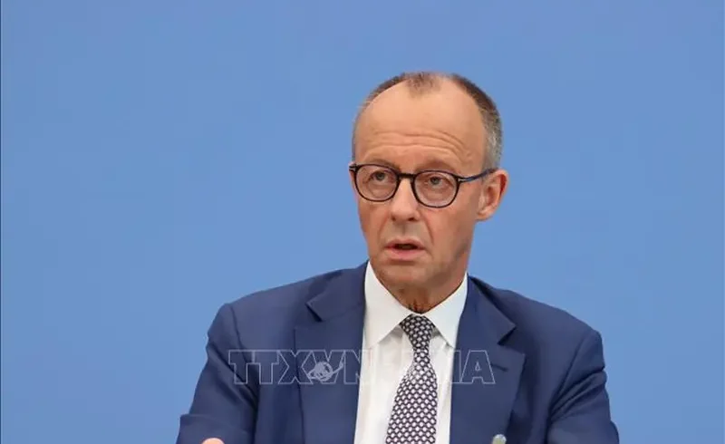 *Thủ tướng Đức Friedrich Merz phát biểu trong cuộc họp báo tại Berlin. Ảnh: THX/TTXVN