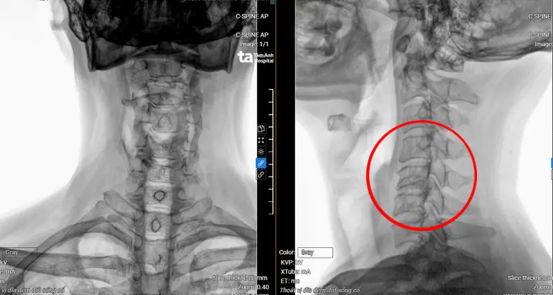ThS.BS.CKI Vũ Đức Thắng, khoa Cột sống Trung tâm chấn thương chỉnh hình Bệnh viện Đa khoa Tâm Anh TP Hồ Chí Minh cho biết, qua kết quả chụp MRI 3 Tesla cho thấy bệnh nhân An bị thoát vị đĩa đệm cột sống cổ nặng từ C3 đến C7, gù cột sống cổ, chèn ép làm tổn thương tủy C5, C6 (vị trí đốt sống cổ thứ 5 và thứ 6). Ngoài ra, cột sống thắt lưng của anh cũng bị thoát vị và chèn ép thần kinh khá nặng ở tầng L4, L5 (vị trí đốt sống lưng thứ 4 và thứ 5).