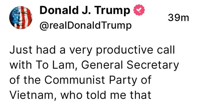 Theo đó, trên mạng xã hội Truth Social, Tổng thống Donald Trump viết: “Tôi vừa có một cuộc điện đàm rất hiệu quả với ông Tô Lâm, Tổng Bí thư Đảng Cộng sản Việt Nam. Ông Tô Lâm nói với tôi rằng Việt Nam muốn giảm thuế quan xuống mức 0 nếu có thể đạt được một thỏa thuận với Mỹ. Tôi đã thay mặt đất nước chúng ta cảm ơn ông, và nói rằng tôi mong đợi một cuộc gặp trong thời gian tới”.