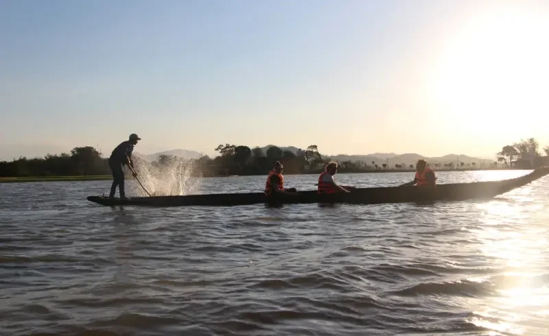 | Du khách thích thú đi thuyền độc mộc ngắm cảnh… |