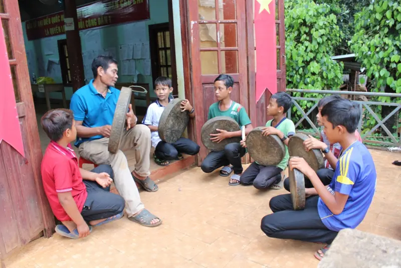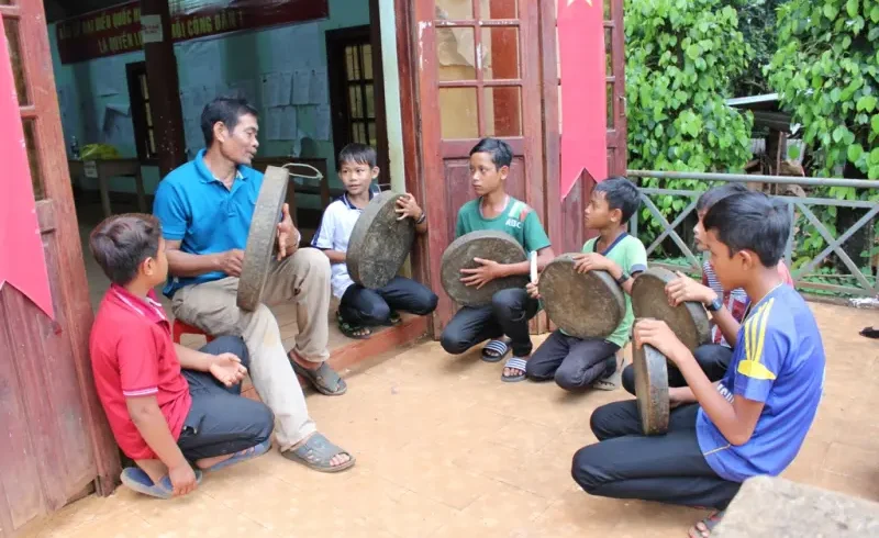 Đây là những lớp học đánh chiêng được chính các nghệ nhân trong buôn giảng dạy cho các em thiếu nhi. Cứ đều đặn vào 16 giờ hằng ngày, ông Y Ơng Bdap (56 tuổi), nghệ nhân cồng chiêng buôn Hra Ea Tlă lên lớp tỉ mẩn sắp xếp lại bộ chiêng tre và chiêng đồng chuẩn bị cho các em đến học. Đúng 16 giờ 30, 11 em trong buôn đã có mặt đầy đủ. Ông Y Ơn tâm sự: “Năm nay tôi cũng đã gần 60 tuổi nhưng đây là lần đầu tiên được truyền dạy một cách bài bản cho các cháu trong buôn về cách đánh chiêng của cha ông, tôi vui lắm!”.