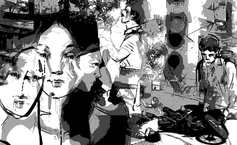 Năm, sáu,…, chín,…, mười ba,… Xung quanh tôi, xe cộ đã chật ních, chen nhau từng milimet. Tôi không còn đủ kiên nhẫn để đếm. Tôi liếc qua một lượt: những khuôn mặt đàn ông già có, trẻ có, nhăn nhó, nhễ nhại mồ hôi dưới cái nắng càng về trưa càng gay gắt; những khuôn mặt phụ nữ được giấu kín sau kính râm, khẩu trang y tế, khẩu trang vải đủ mọi hình thù, hoa văn, màu sắc. Độ tuổi của họ chỉ có thể ước chừng qua dáng người và trang phục. Tôi nhìn đằng trước, đèn vẫn chưa chuyển màu. Tôi nhìn hai bên và đằng sau chỉ thấy người và xe. Chưa bao giờ tôi thấy một ngã tư nào đông đúc như thế. Nhốn nháo. Ồn ào. Tưởng rằng đèn giao thông sẽ khiến mọi thứ trật tự hơn, nhưng hóa ra đôi khi nó lại khiến tình hình thêm lộn xộn trong sự căng cứng và cố tỏ ra hết sức bình tĩnh, kiềm chế của mọi người. Xe và người càng lúc càng đông, chỉ thêm chứ không bớt. Không khí ngột ngạt, đặc quánh vì nắng, bụi, mồ hôi người, mùi động cơ, mùi xăng và đủ loại tiếng động có tên và không tên. Tôi cảm thấy như mình đang ngạt thở. Tôi nhớ đi qua ngã tư này sẽ có quán cà phê nhiều cây xanh. Lát nữa tôi sẽ tấp vào đó, tìm bàn dưới bóng cây và gọi ly nước mát.