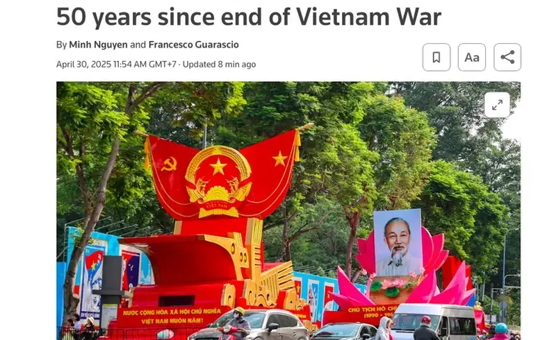 Hãng thông tấn AP của Mỹ đưa tin Việt Nam đã long trọng tổ chức lễ kỷ niệm 50 năm ngày kết thúc chiến tranh, mở ra kỷ nguyên đất nước thống nhất, với một cuộc diễu hành quy mô lớn cùng thông điệp hướng đến một tương lai hòa bình. Theo AP, hàng nghìn người dân đã đổ ra đường từ đêm hôm trước để giữ chỗ, uống cà phê, vẽ cờ lên mặt và hòa mình trong không khí náo nhiệt.