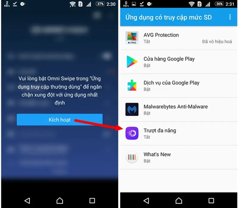 Ngoài ra, nếu xuất hiện một hộp thoại (như hình minh họa bên dưới) trong lần đầu tiên sử dụng, bạn nhấn nút “Kích hoạt”, sau đó tìm đến mục “Trượt đa năng” từ danh sách hiện ra rồi kích hoạt chức năng “Cho phép quyền truy cập sử dụng”.