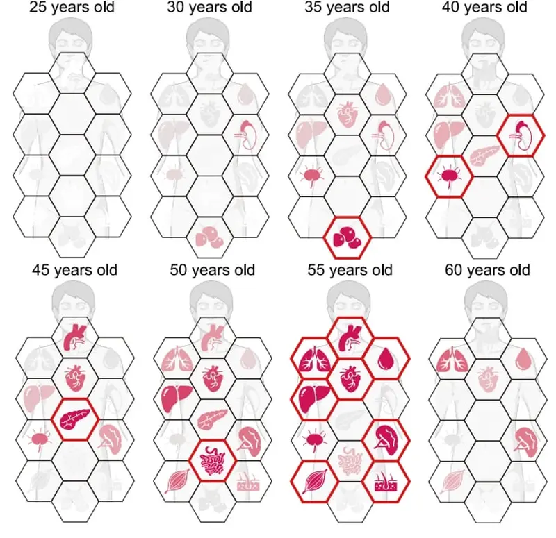 Khác với những nghiên cứu trước đây thường tập trung vào gen hay các chỉ số chung chung trong máu, nhóm nghiên cứu này đã chọn một hướng đi táo bạo và chi tiết hơn. Họ đi sâu vào phân tích hàng loạt các protein, những “công nhân” thực thụ vận hành mọi hoạt động sống trong tế bào. Bằng cách phân tích mẫu vật từ nhiều loại mô và cơ quan khác nhau ở các độ tuổi, các nhà khoa học đã dựng nên một bức tranh toàn cảnh về việc các bộ phận trong cơ thể chúng ta già đi theo những nhịp điệu hoàn toàn khác nhau. Và kết quả chỉ ra rằng, khoảng thời gian từ 45 đến 55 tuổi, với đỉnh điểm là tuổi 50 chính là giai đoạn “bão tố” nhất.