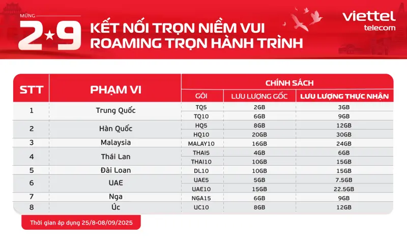 Nằm trong chương trình “Kết nối trọn niềm vui – Mừng 2/9”, từ 25/8 – 8/9/2025, thuê bao Viettel sẽ được nhận thêm 50% lưu lượng data khi đăng ký gói cước Roaming tại Hàn Quốc, Trung Quốc, Malaysia, Thái Lan, Đài Loan (Trung Quốc), UAE, Nga và Úc.